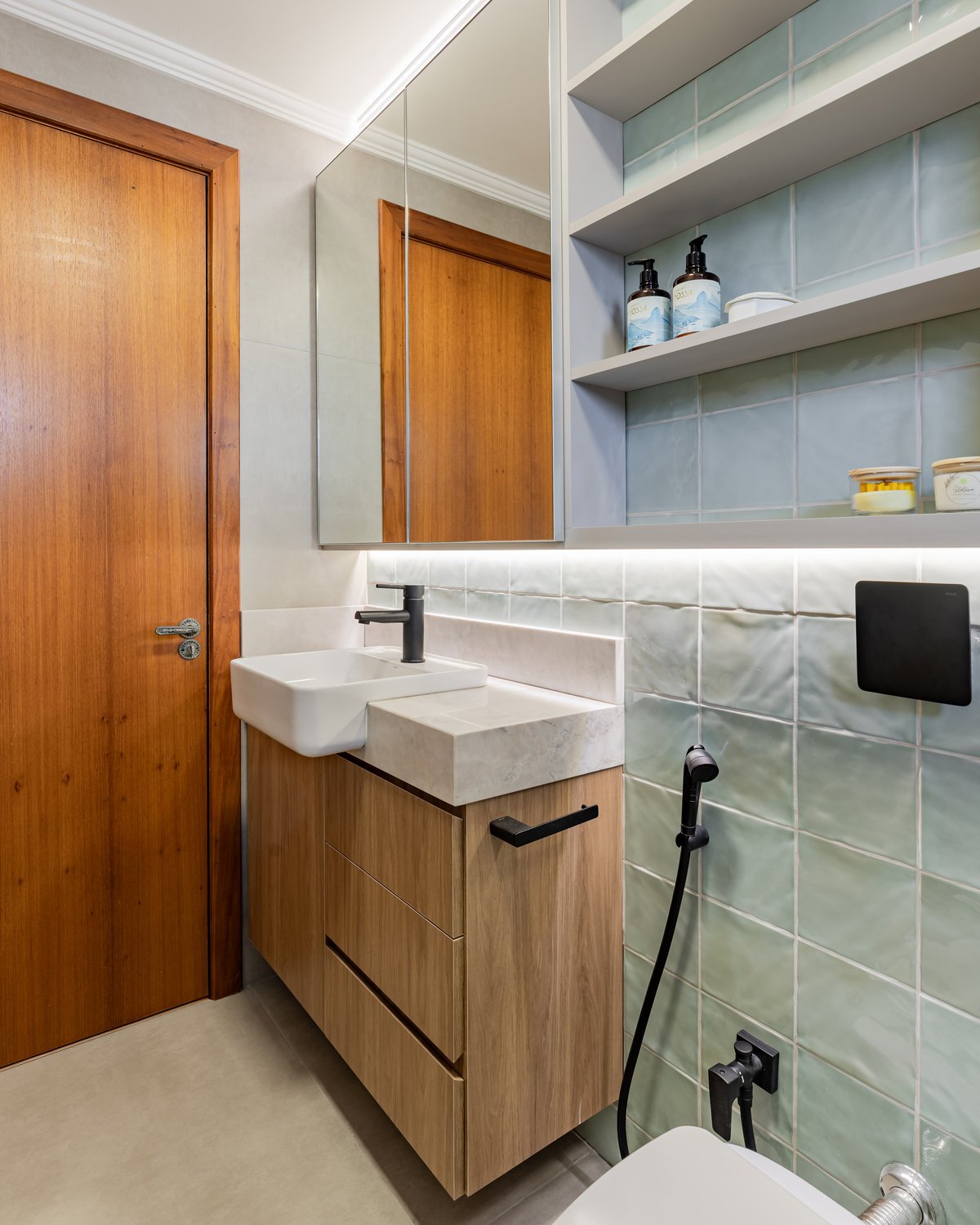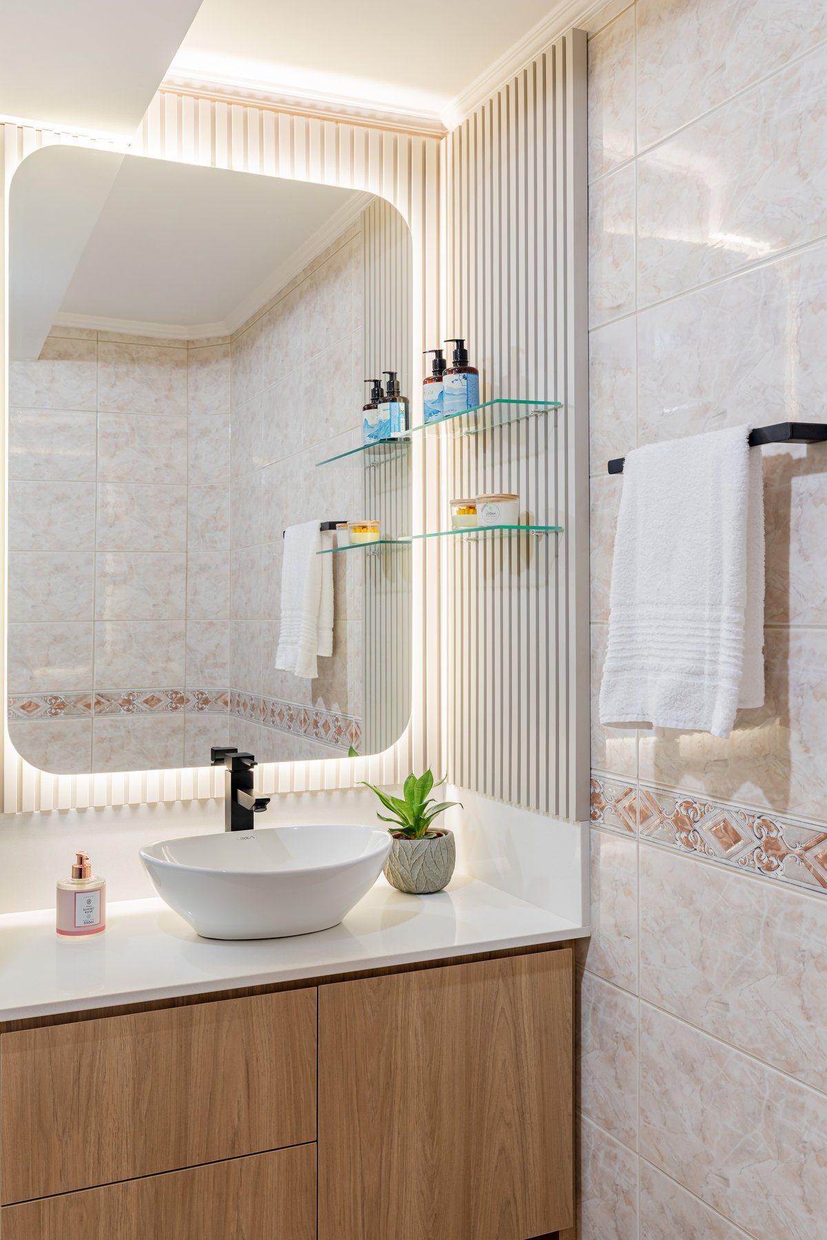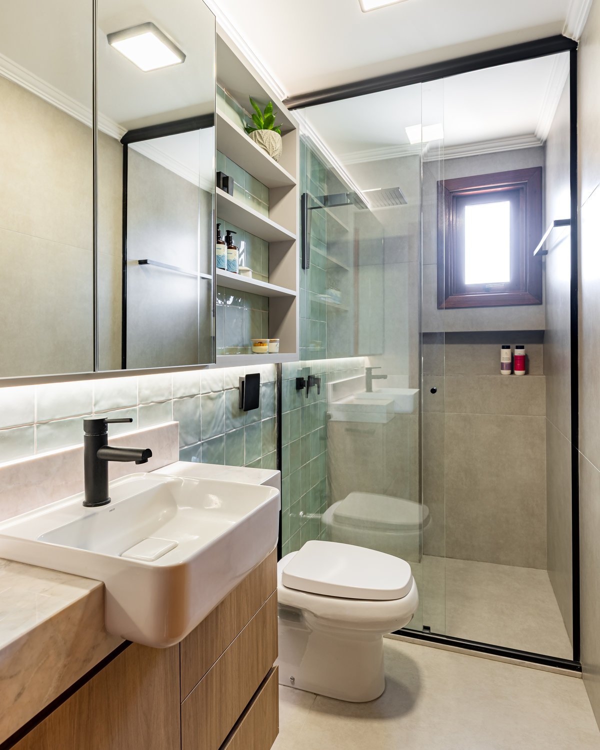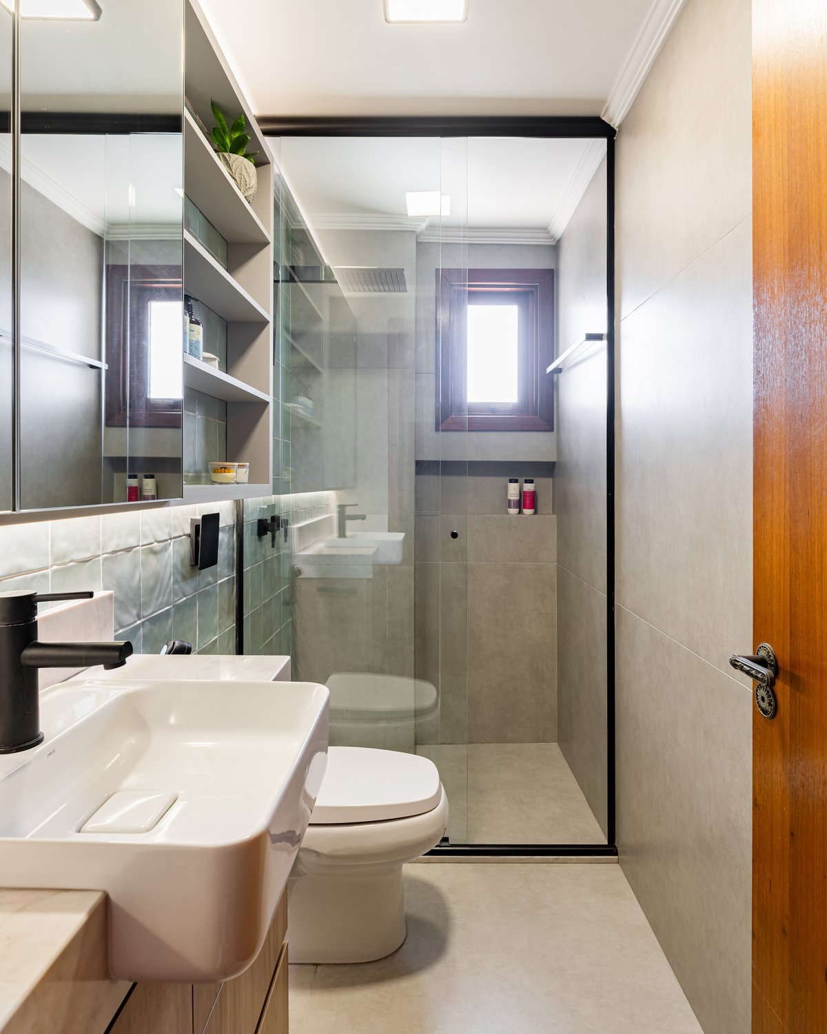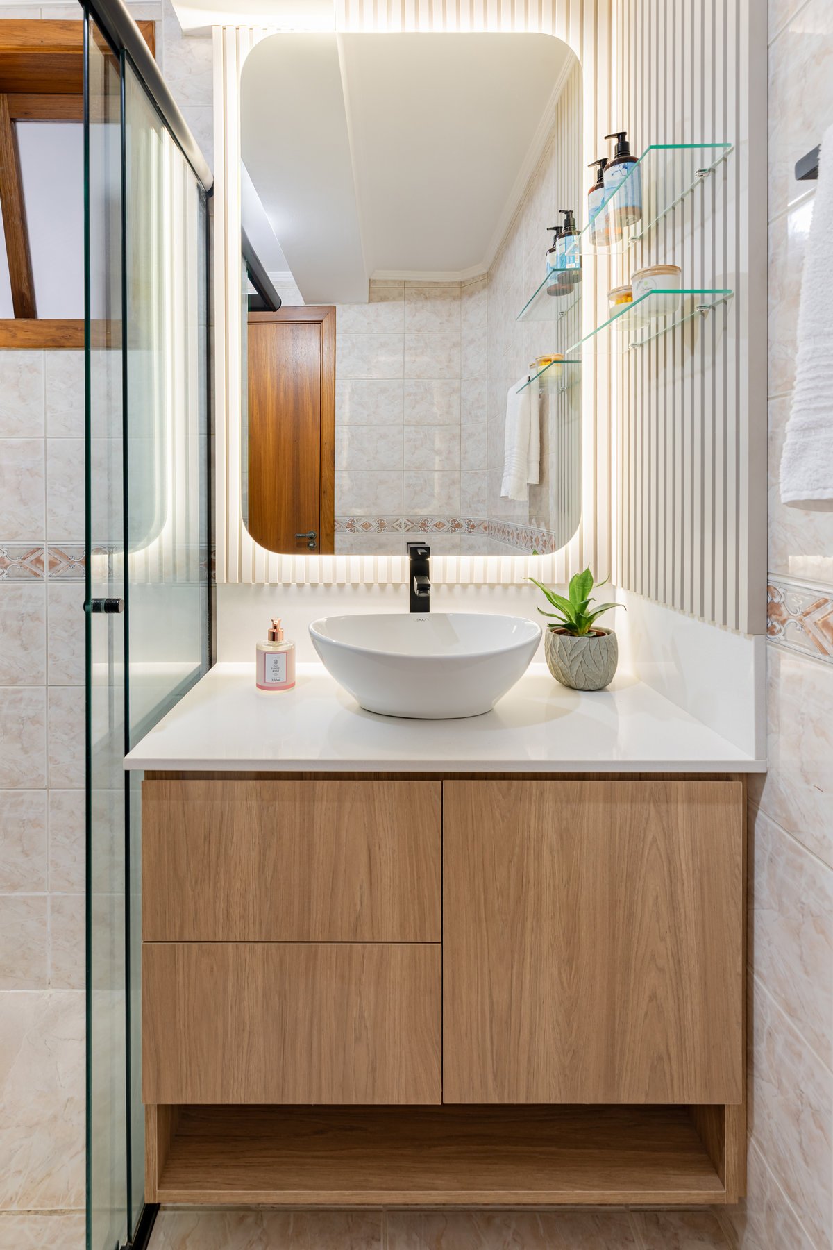 Este projeto trouxe uma renovação completa para o banheiro da suíte e intervenções pontuais no banheiro social, atendendo às necessidades práticas e estéticas da cliente. Na suíte, a antiga banheira que não era utilizada e ainda causava infiltrações foi removida, dando lugar a um ambiente totalmente reformado: novos revestimentos e piso, impermeabilização adequada, nicho embutido no box, novos acabamentos e mobiliário funcional. Porta e janela receberam tratamento especial, a iluminação foi renovada e o espaço, antes sem uso, transformou-se em um banheiro moderno, prático e aconchegante. Já no banheiro social, optamos por manter piso, revestimentos e bacia sanitária, mas o móvel foi projetado novo, trazendo leveza e amplitude. Os acabamentos novos em preto e a troca da luminária central atualizaram o ambiente, deixando-o delicado e harmônico. O resultado foi a valorização de dois espaços essenciais, agora mais funcionais, modernos e convidativos.