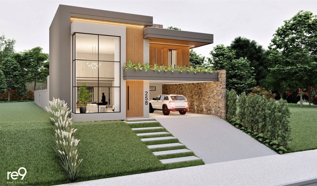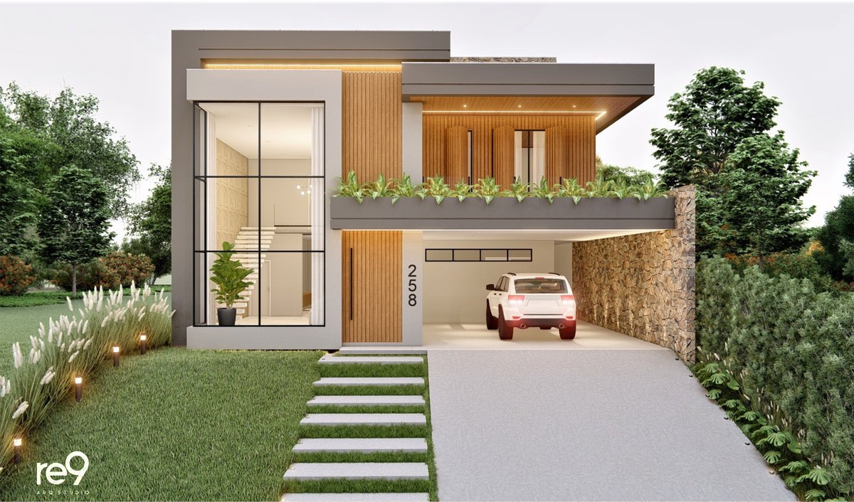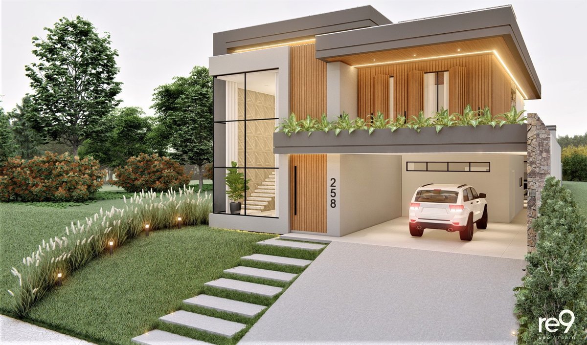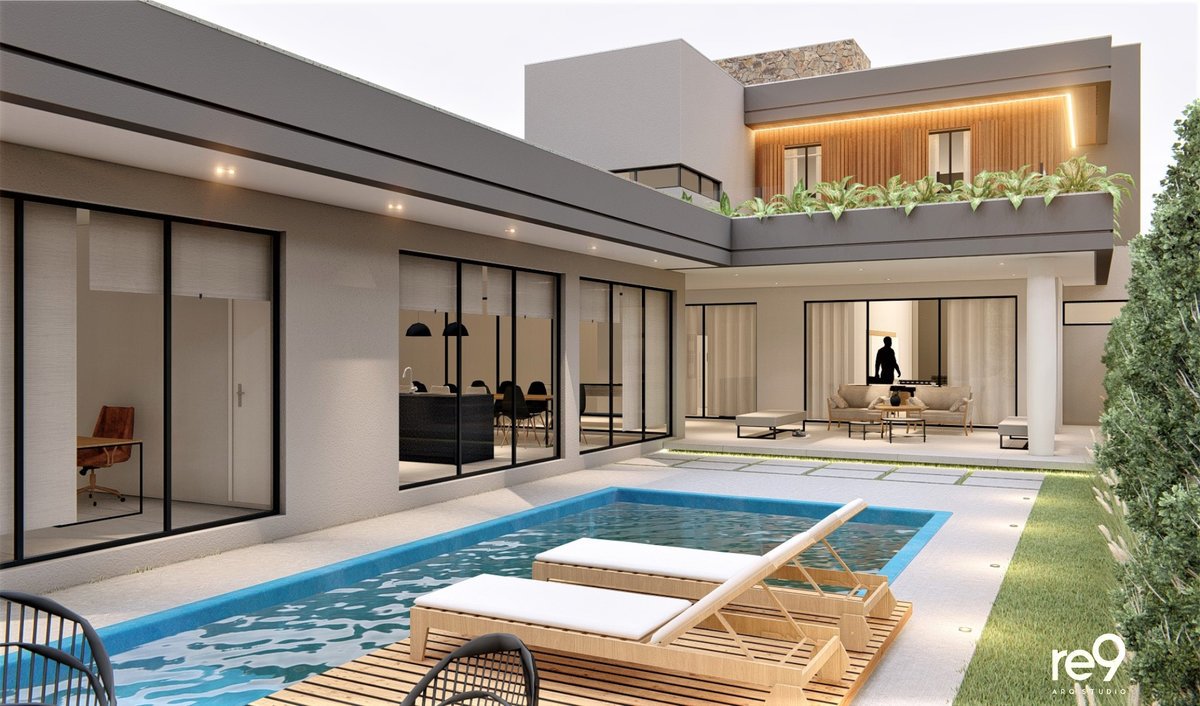 A Casa M.G foi concebida para um casal que desejava uma residência ampla, sofisticada e imponente, com ambientes bem resolvidos em um terreno de 12,76m de frente. Com 461m² distribuídos em dois pavimentos, o térreo abriga a área social e de serviços, enquanto o pavimento superior concentra a área íntima, sempre valorizando a orientação solar e a ventilação natural para maior conforto. O espaço de lazer foi integrado ao térreo por meio de uma ampla varanda, que conecta interior e exterior de forma fluida. A madeira assume papel de destaque nas fachadas, aplicada em revestimentos e brises, conferindo identidade, elegância e aconchego ao conjunto arquitetônico. A piscina, estrategicamente posicionada no pátio, funciona como um ponto de luz e frescor, trazendo vida e leveza à composição. O resultado é uma casa marcante, que alia imponência, sofisticação e conforto em perfeita harmonia.