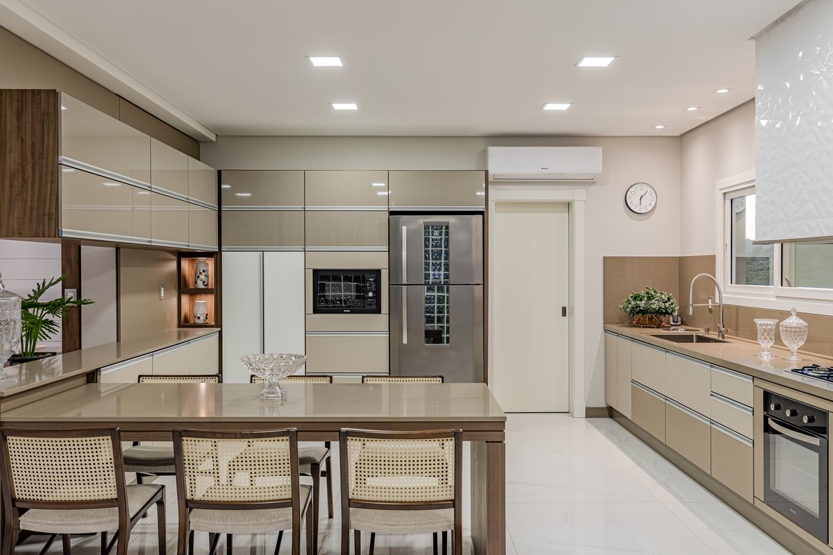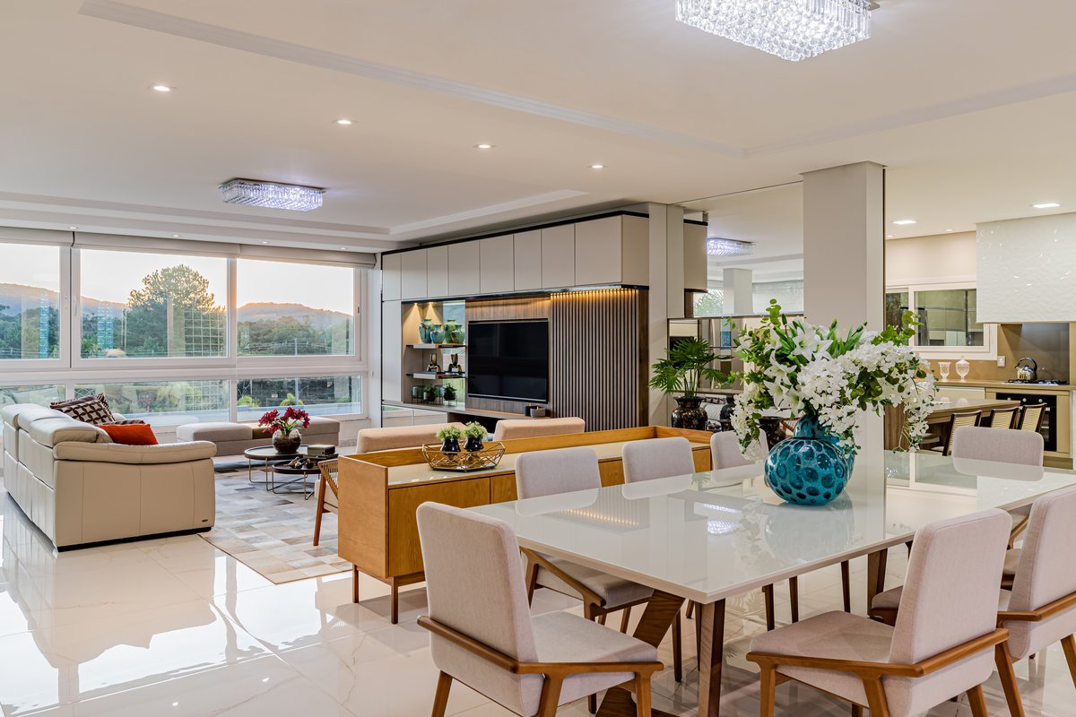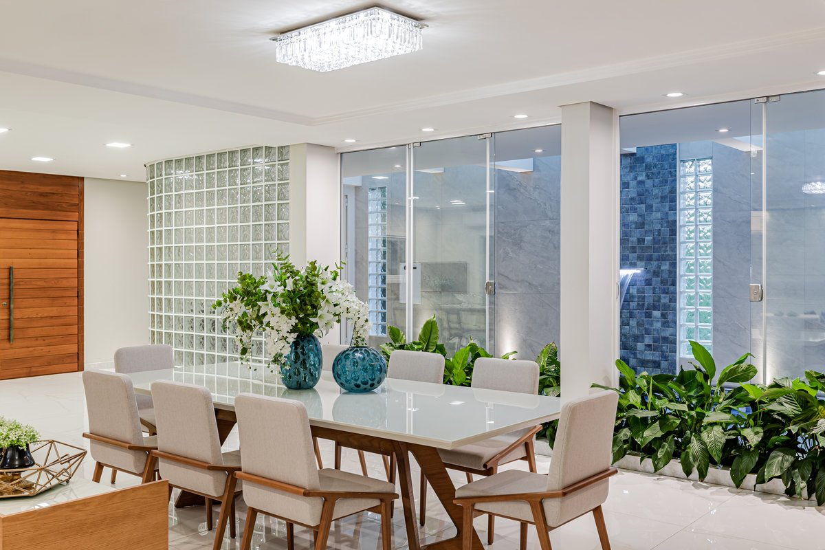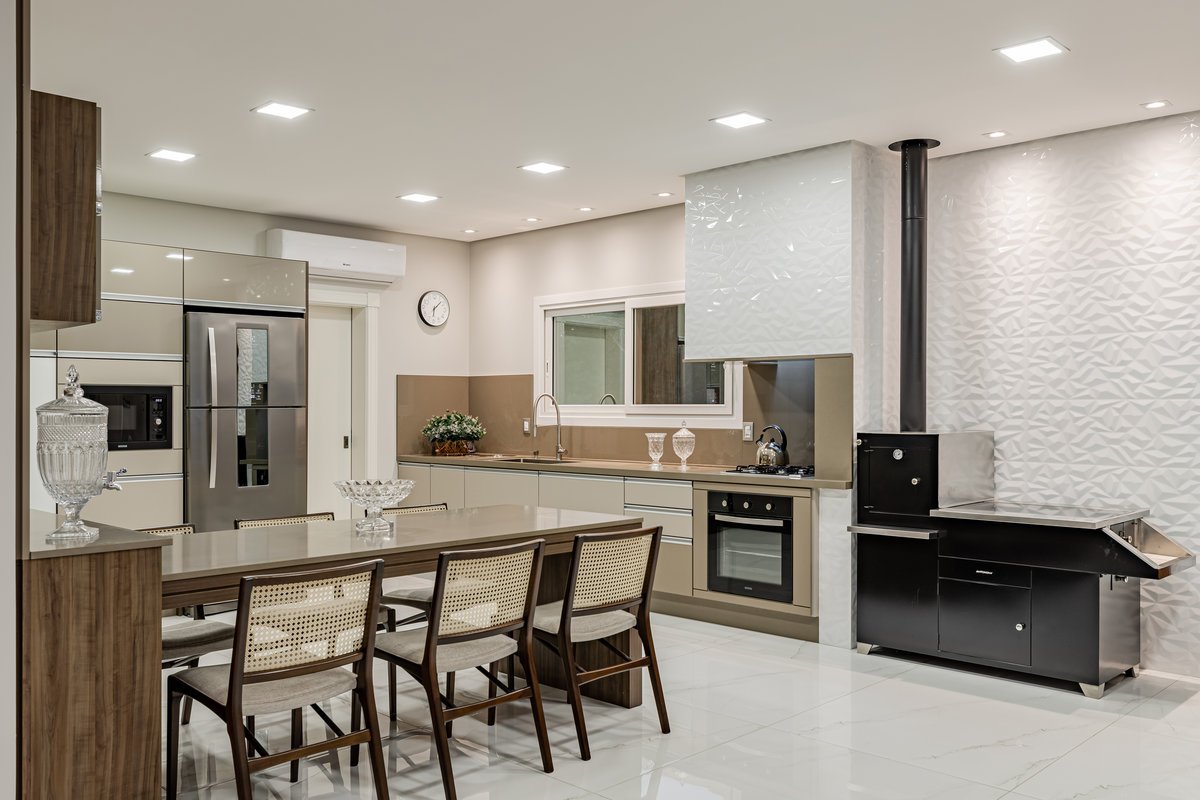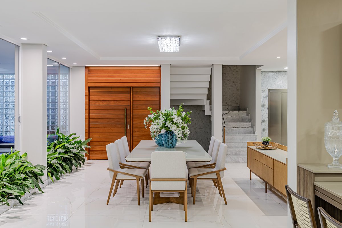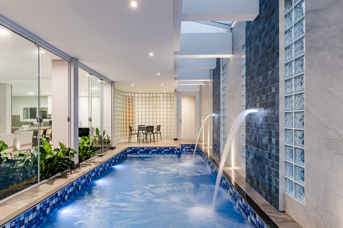 A Casa N.L. nasceu do desejo dos clientes de repaginar fachadas e reestudar a planta ainda antes da construção, buscando uma arquitetura mais delicada e contemporânea. A volumetria foi ajustada e os interiores redesenhados, garantindo melhor funcionalidade sem abrir mão da estética. A piscina interna recebeu apoio técnico no subsolo, liberando espaço no térreo, que passou a abrigar apenas os banheiros sociais. Cada detalhe foi projetado minuciosamente – forros, iluminação, pisos, revestimentos, mobiliário fixo e solto, decoração – para refletir o estilo moderno, elegante e sofisticado da família. As suítes foram personalizadas para traduzir a identidade de filhos e netos, tornando cada ambiente único. O espaço social foi idealizado para reunir amigos e familiares, trazendo acolhimento e praticidade sem a necessidade de anexos separados. Já o gourmet, concebido em estrutura metálica preta e fechado por vidro, cria uma linguagem contemporânea e uma forte conexão com a natureza, equilibrando-se com harmonia à arquitetura da casa.