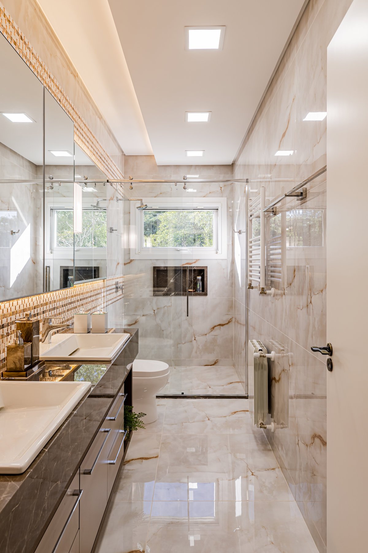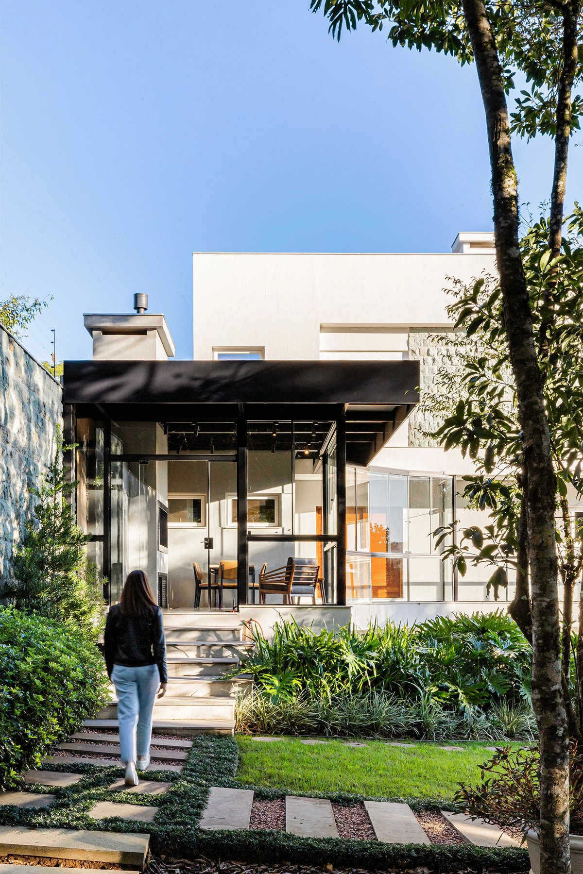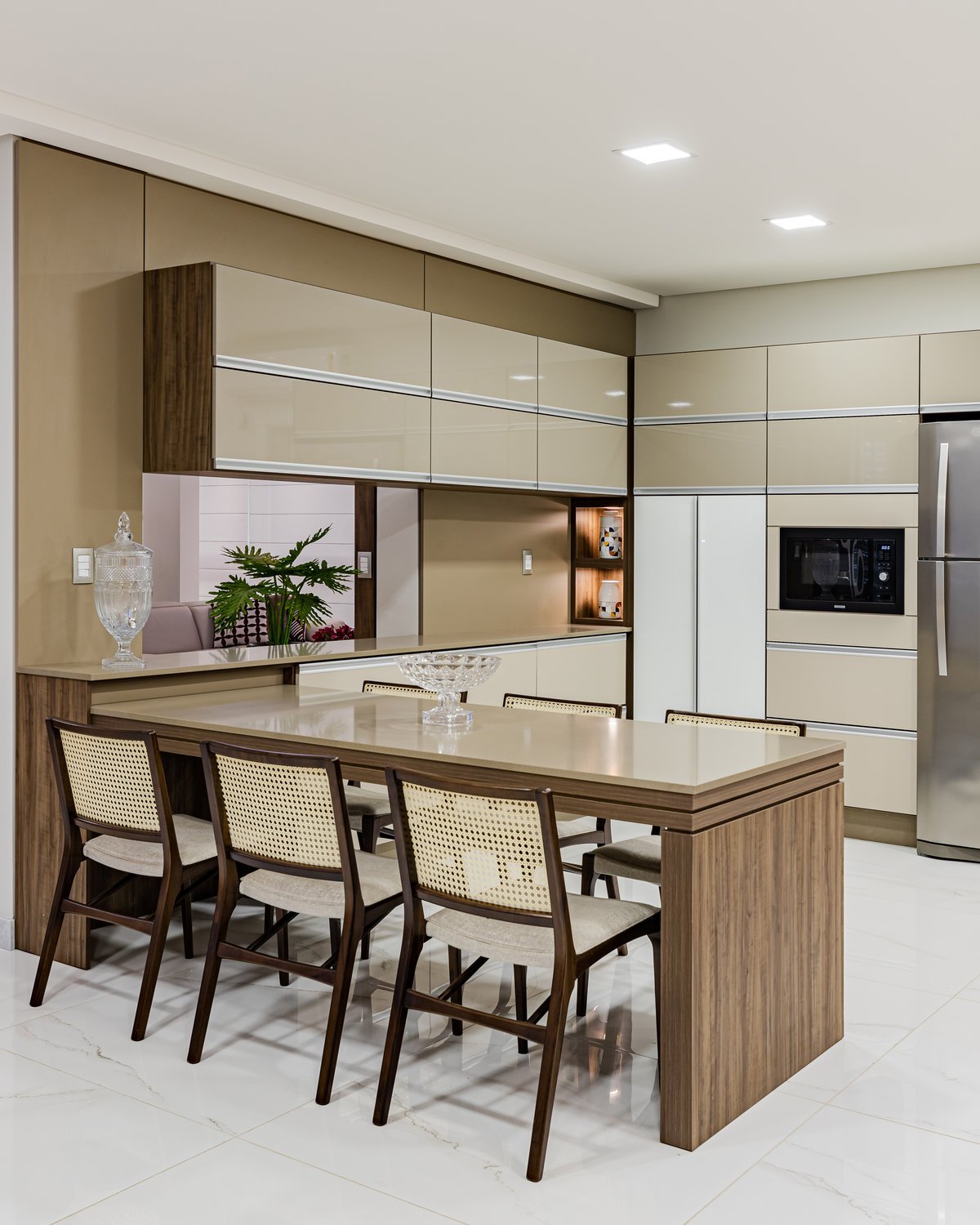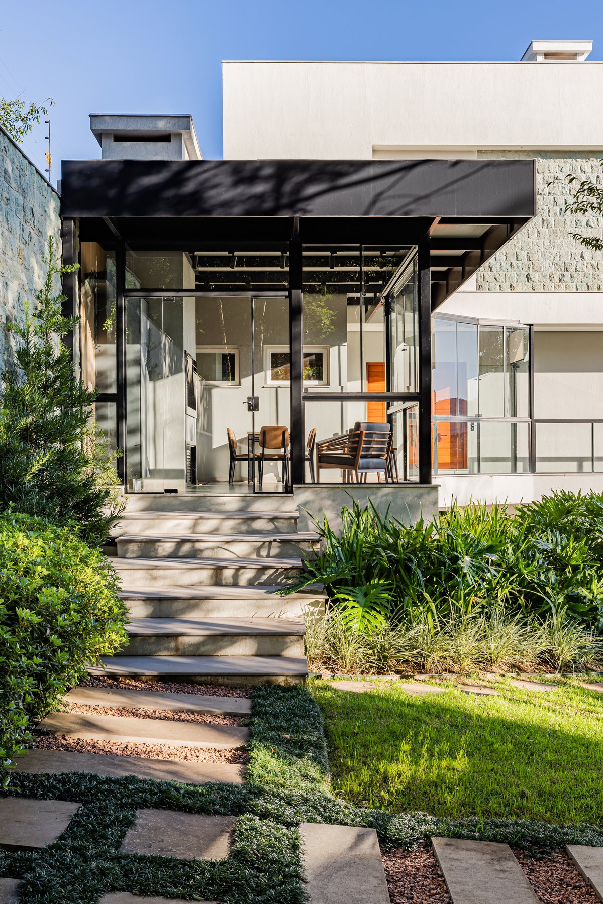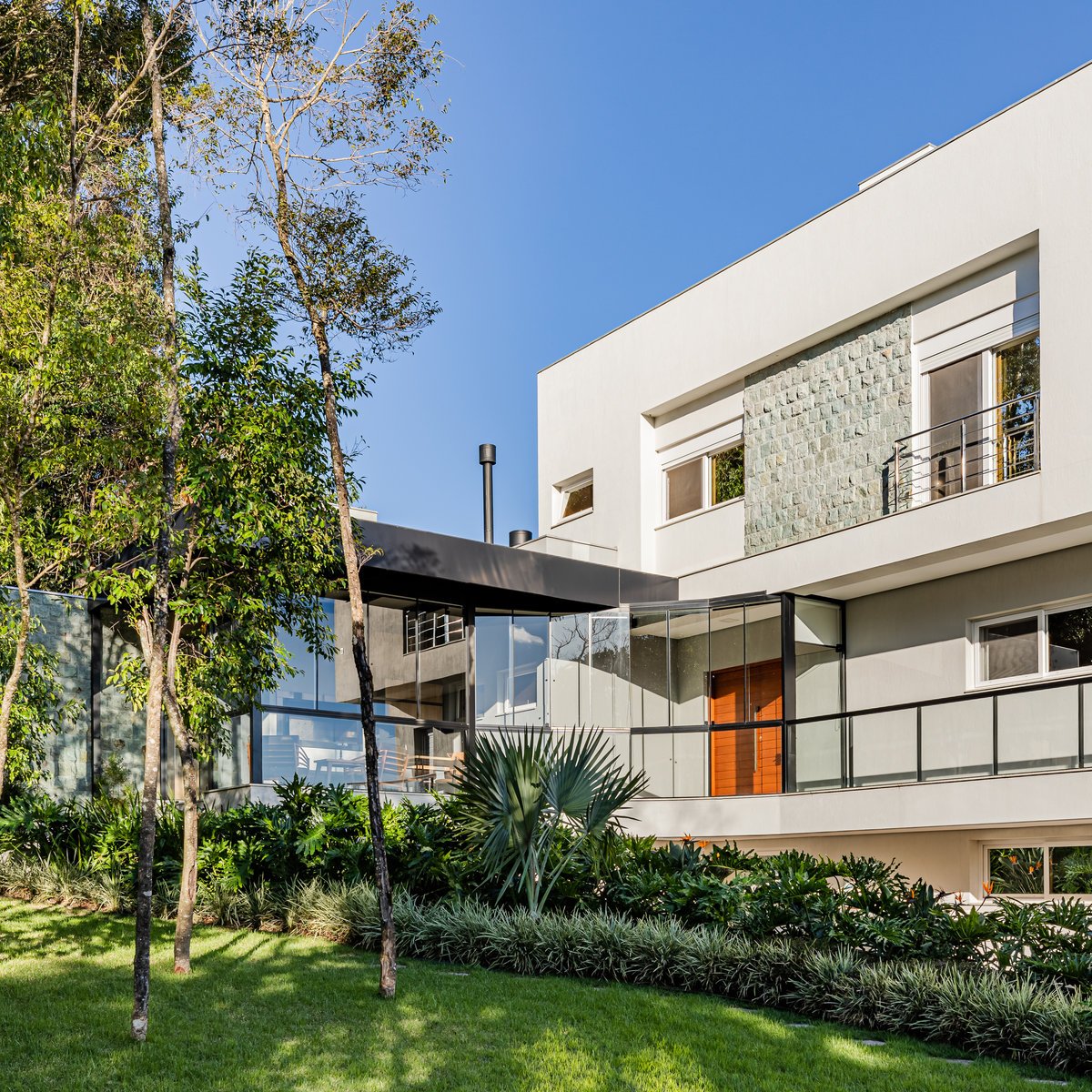 A Casa N.L. nasceu do desejo dos clientes de repaginar fachadas e reestudar a planta ainda antes da construção, buscando uma arquitetura mais delicada e contemporânea. A volumetria foi ajustada e os interiores redesenhados, garantindo melhor funcionalidade sem abrir mão da estética. A piscina interna recebeu apoio técnico no subsolo, liberando espaço no térreo, que passou a abrigar apenas os banheiros sociais. Cada detalhe foi projetado minuciosamente – forros, iluminação, pisos, revestimentos, mobiliário fixo e solto, decoração – para refletir o estilo moderno, elegante e sofisticado da família. As suítes foram personalizadas para traduzir a identidade de filhos e netos, tornando cada ambiente único. O espaço social foi idealizado para reunir amigos e familiares, trazendo acolhimento e praticidade sem a necessidade de anexos separados. Já o gourmet, concebido em estrutura metálica preta e fechado por vidro, cria uma linguagem contemporânea e uma forte conexão com a natureza, equilibrando-se com harmonia à arquitetura da casa.