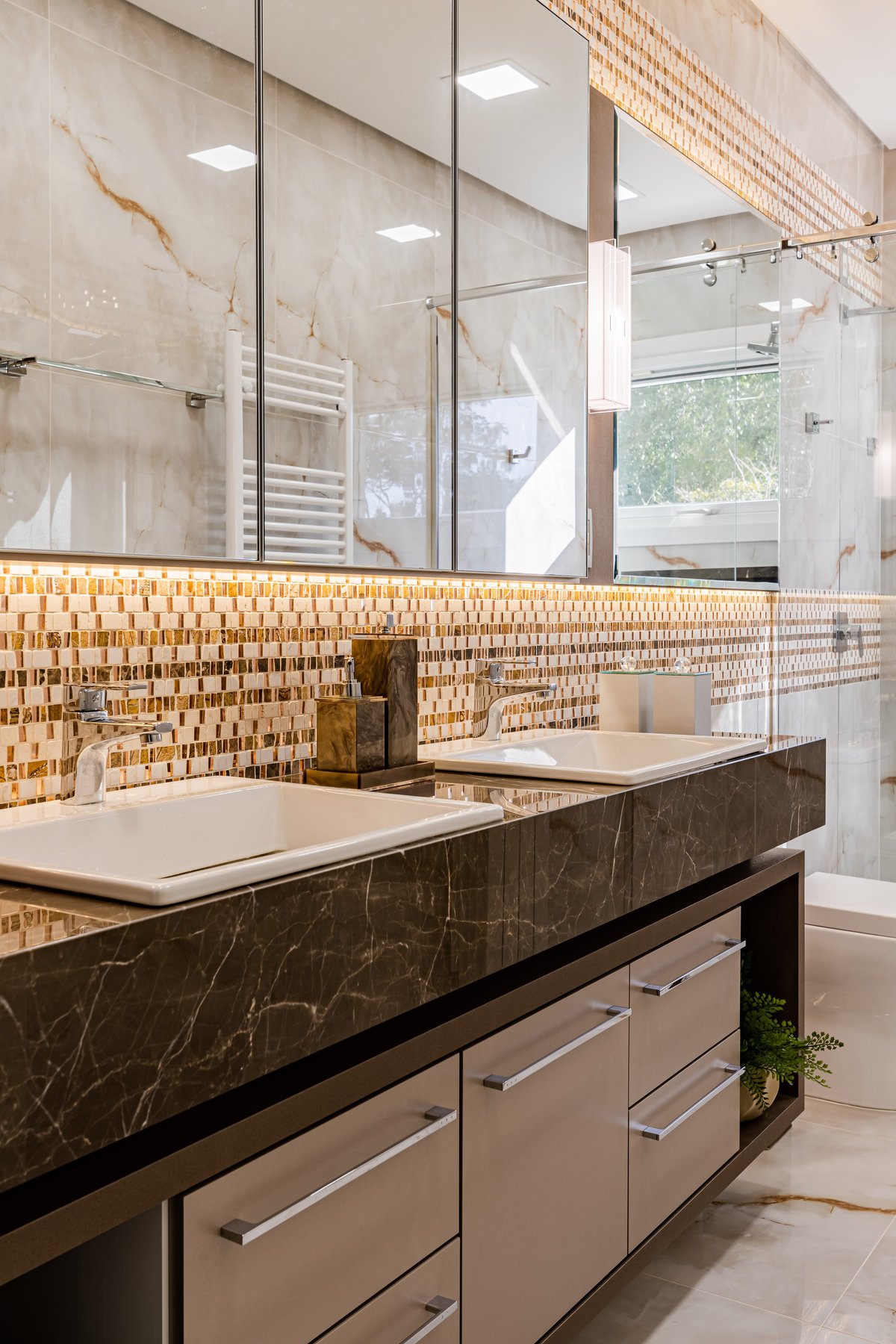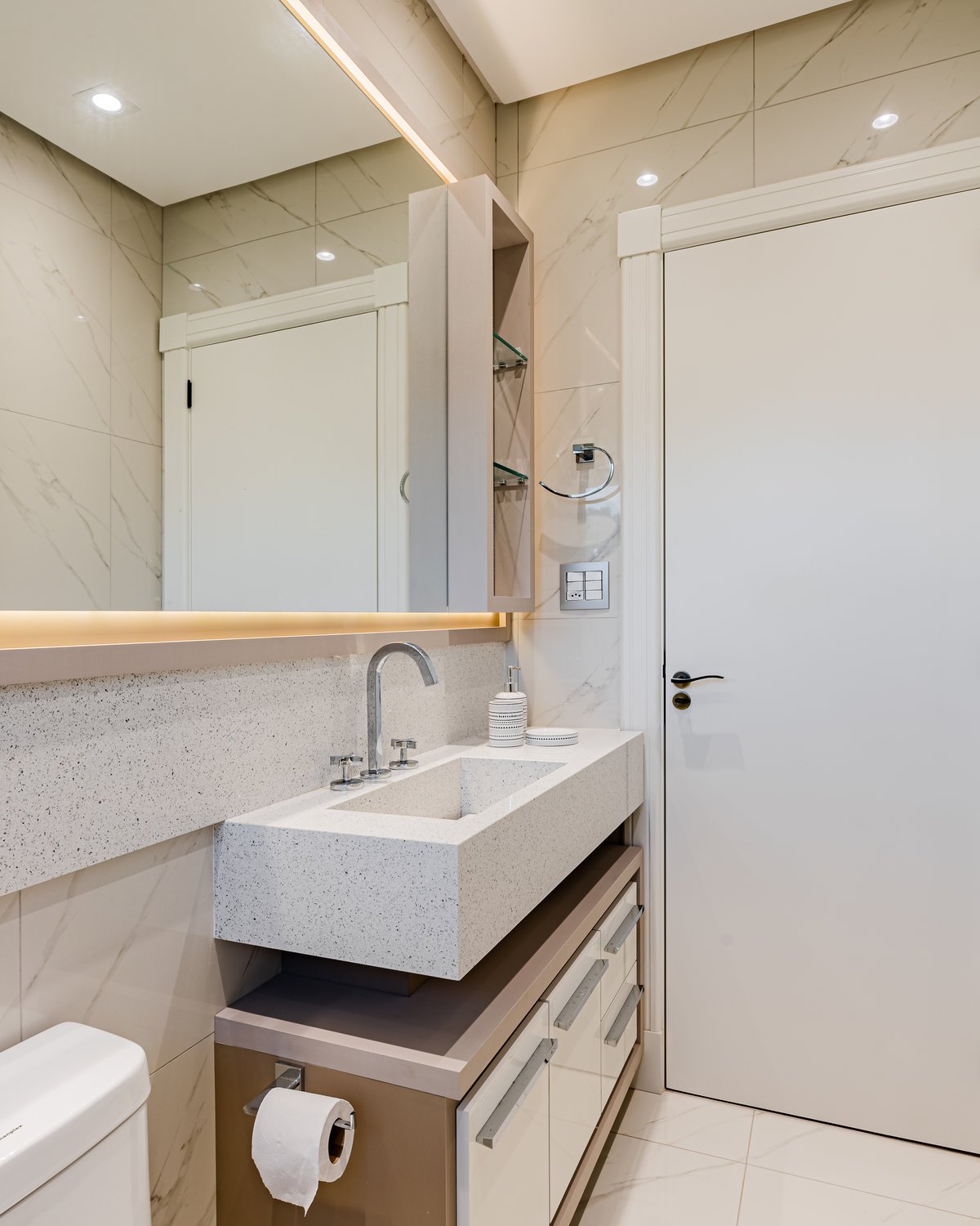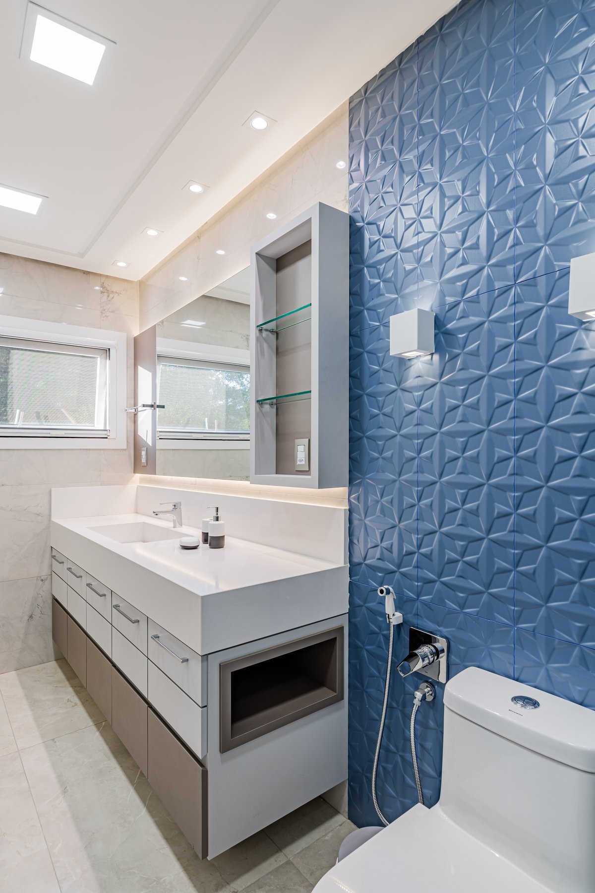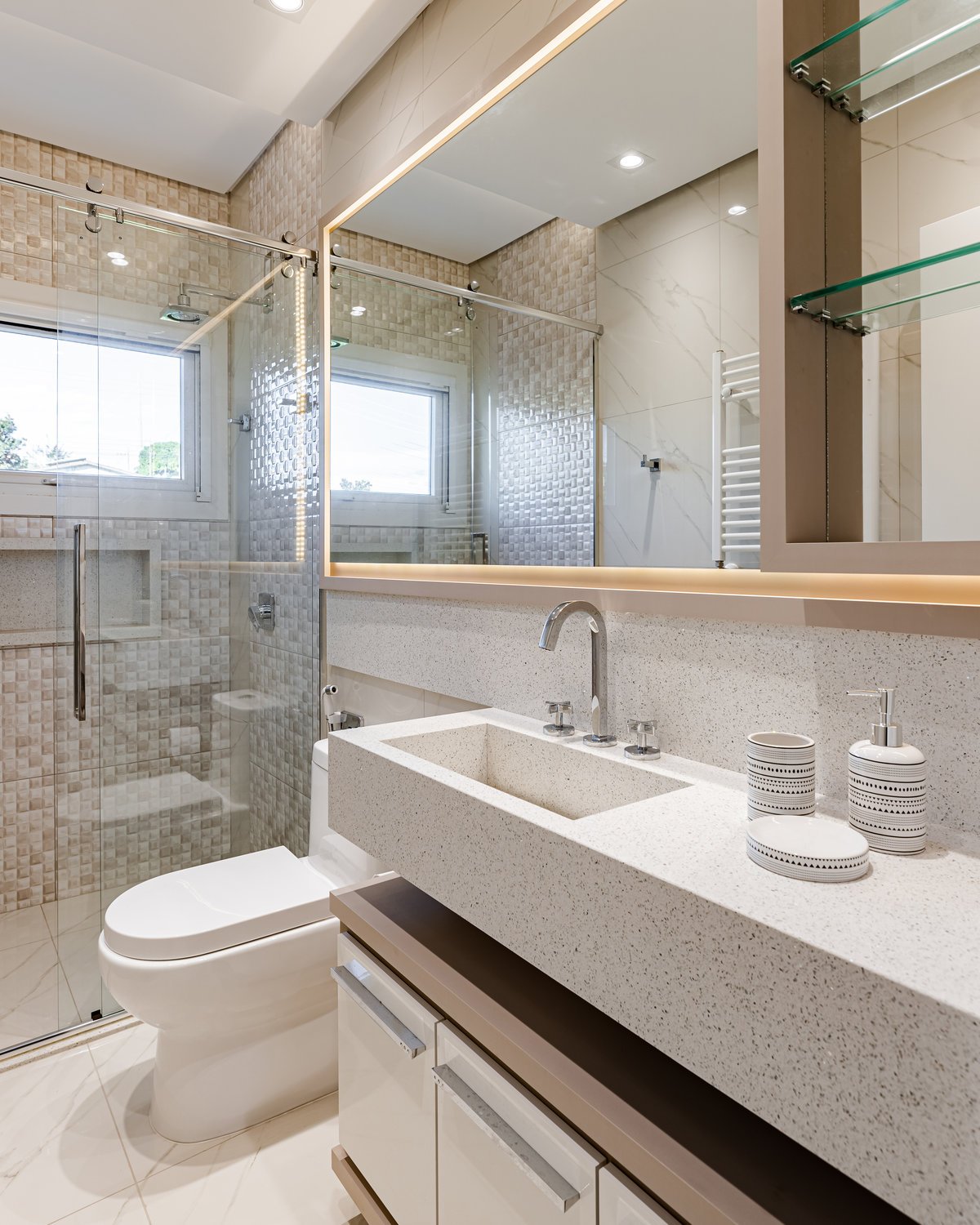 A Casa N.L. nasceu do desejo dos clientes de repaginar fachadas e reestudar a planta ainda antes da construção, buscando uma arquitetura mais delicada e contemporânea. A volumetria foi ajustada e os interiores redesenhados, garantindo melhor funcionalidade sem abrir mão da estética. A piscina interna recebeu apoio técnico no subsolo, liberando espaço no térreo, que passou a abrigar apenas os banheiros sociais. Cada detalhe foi projetado minuciosamente – forros, iluminação, pisos, revestimentos, mobiliário fixo e solto, decoração – para refletir o estilo moderno, elegante e sofisticado da família. As suítes foram personalizadas para traduzir a identidade de filhos e netos, tornando cada ambiente único. O espaço social foi idealizado para reunir amigos e familiares, trazendo acolhimento e praticidade sem a necessidade de anexos separados. Já o gourmet, concebido em estrutura metálica preta e fechado por vidro, cria uma linguagem contemporânea e uma forte conexão com a natureza, equilibrando-se com harmonia à arquitetura da casa.