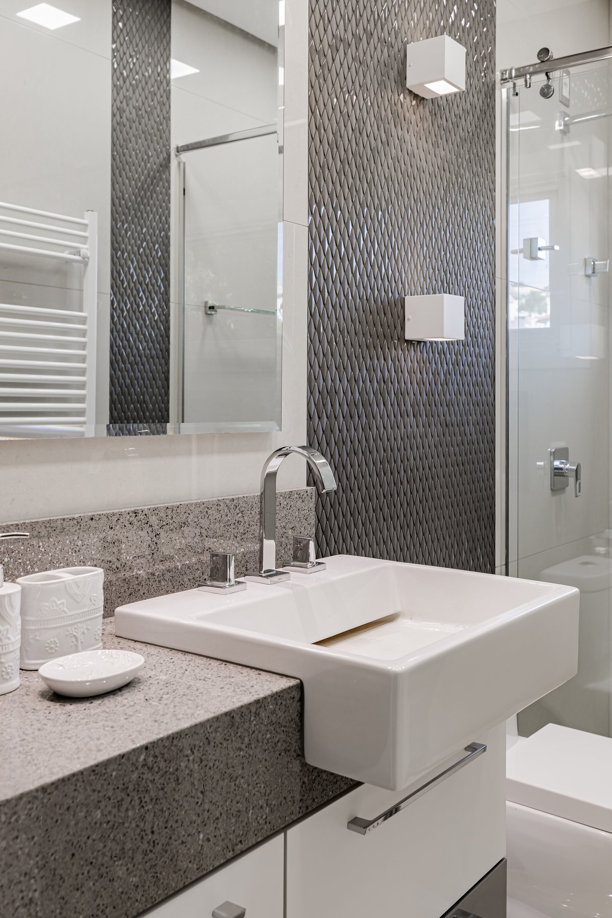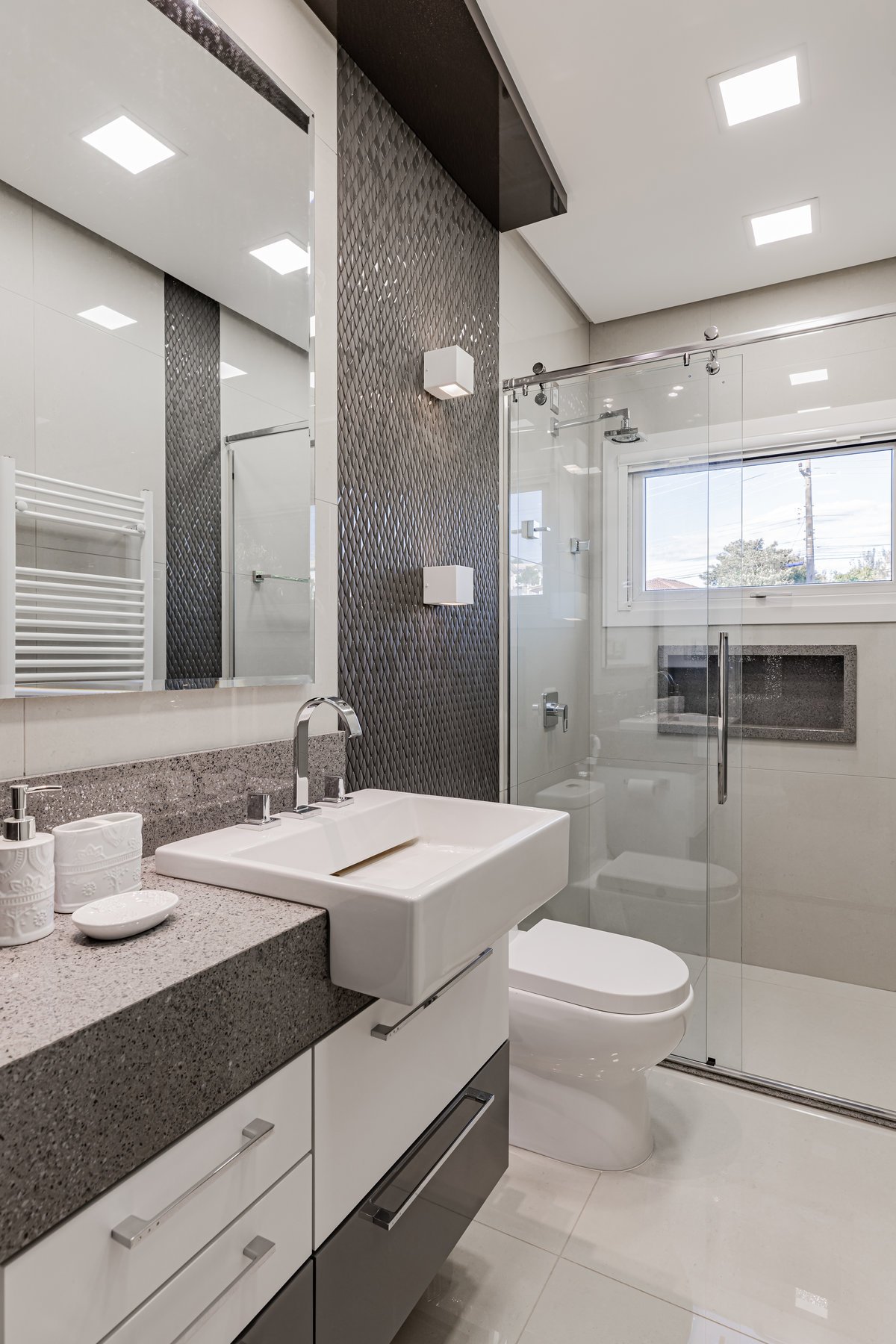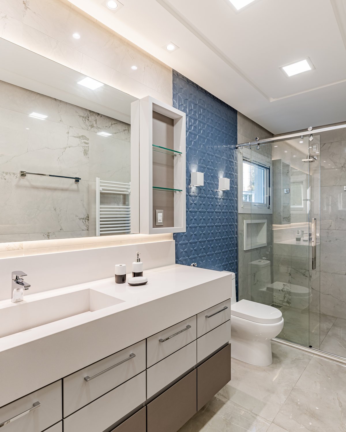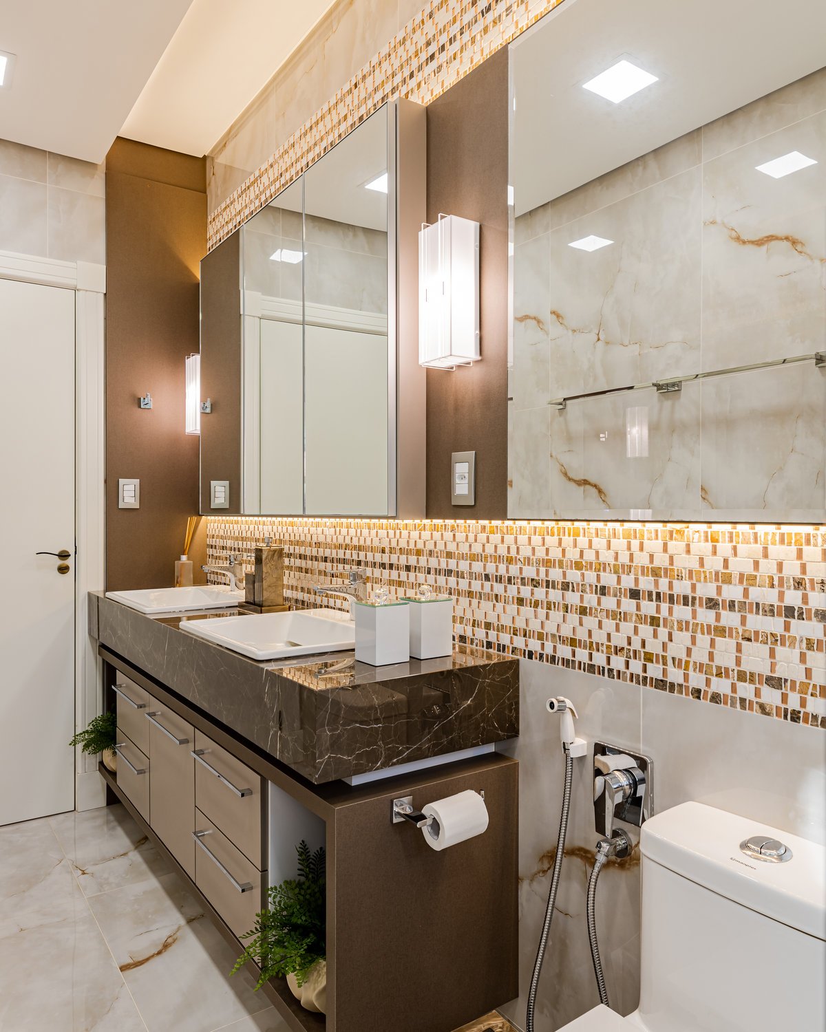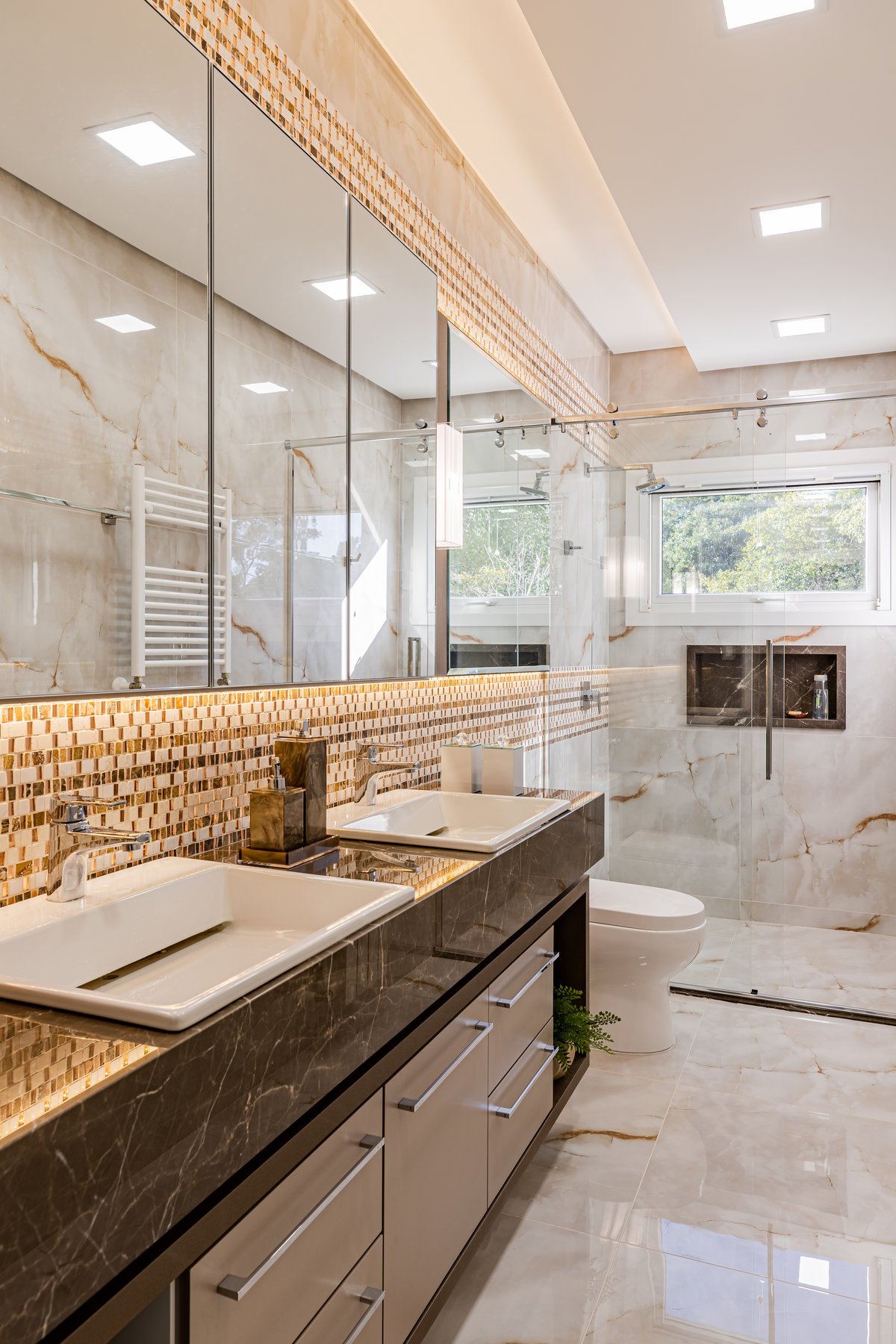 A Casa N.L. nasceu do desejo dos clientes de repaginar fachadas e reestudar a planta ainda antes da construção, buscando uma arquitetura mais delicada e contemporânea. A volumetria foi ajustada e os interiores redesenhados, garantindo melhor funcionalidade sem abrir mão da estética. A piscina interna recebeu apoio técnico no subsolo, liberando espaço no térreo, que passou a abrigar apenas os banheiros sociais. Cada detalhe foi projetado minuciosamente – forros, iluminação, pisos, revestimentos, mobiliário fixo e solto, decoração – para refletir o estilo moderno, elegante e sofisticado da família. As suítes foram personalizadas para traduzir a identidade de filhos e netos, tornando cada ambiente único. O espaço social foi idealizado para reunir amigos e familiares, trazendo acolhimento e praticidade sem a necessidade de anexos separados. Já o gourmet, concebido em estrutura metálica preta e fechado por vidro, cria uma linguagem contemporânea e uma forte conexão com a natureza, equilibrando-se com harmonia à arquitetura da casa.
