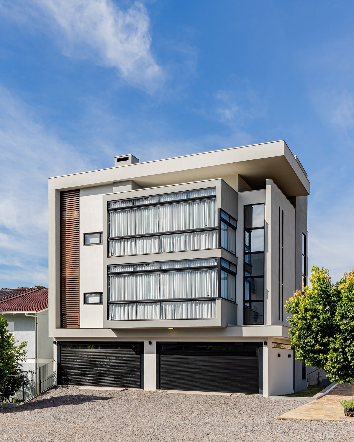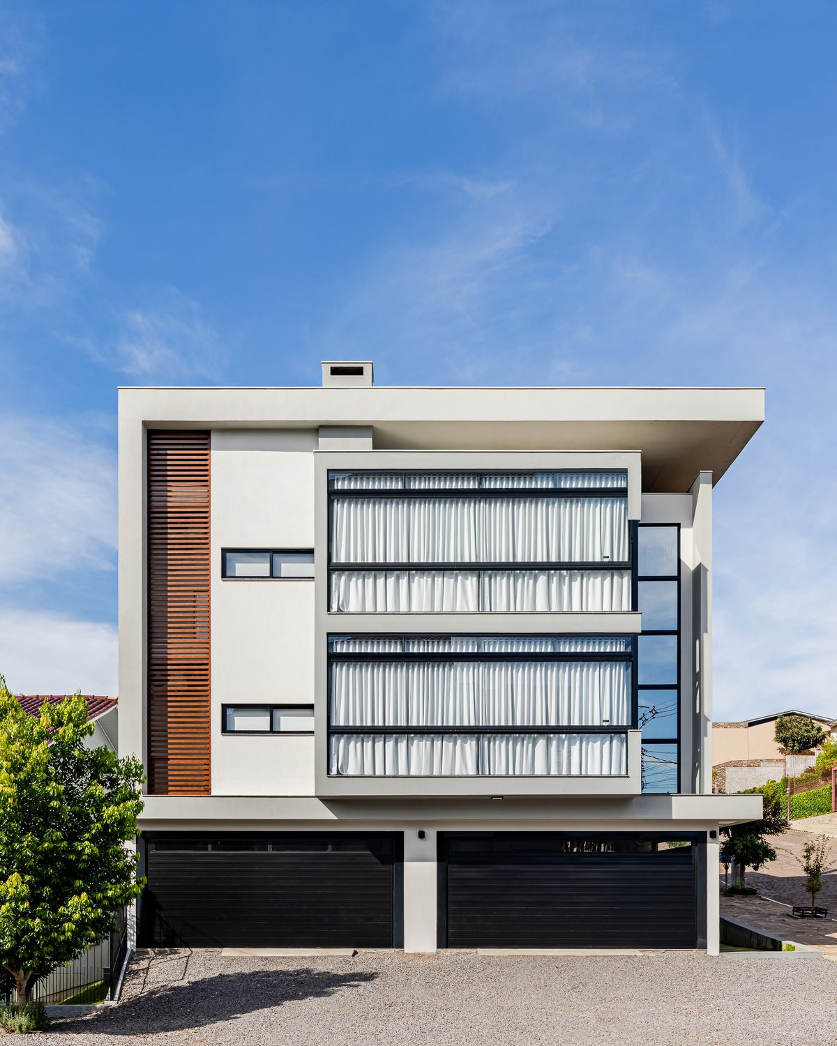 O Residencial C.L.A.R é um edifício familiar desenvolvido em três pavimentos: no térreo, garagem e salão de festas; no 2º e 3º pavimento, um apartamento exclusivo por andar. O grande desafio foi organizar todo o programa em um terreno de 15 x 17m, mantendo funcionalidade e estética, e o resultado foi uma solução eficiente e harmônica. Os acessos, a circulação vertical e a distribuição interna de cada apartamento foram cuidadosamente planejados, garantindo fluidez e conforto. A posição solar também orientou o projeto, assegurando ambientes bem iluminados e ventilados. Na arquitetura, optamos pelo estilo contemporâneo, com volumes bem definidos, linhas retas e o uso de esquadrias pretas em alumínio, combinadas a cores neutras. O revestimento amadeirado confere identidade e destaque à fachada, tornando o conjunto imponente, elegante e marcante no cenário urbano. Um projeto que alia técnica e estética, criando um edifício funcional, moderno e de forte personalidade.