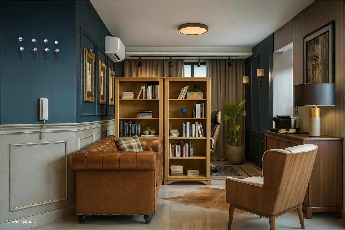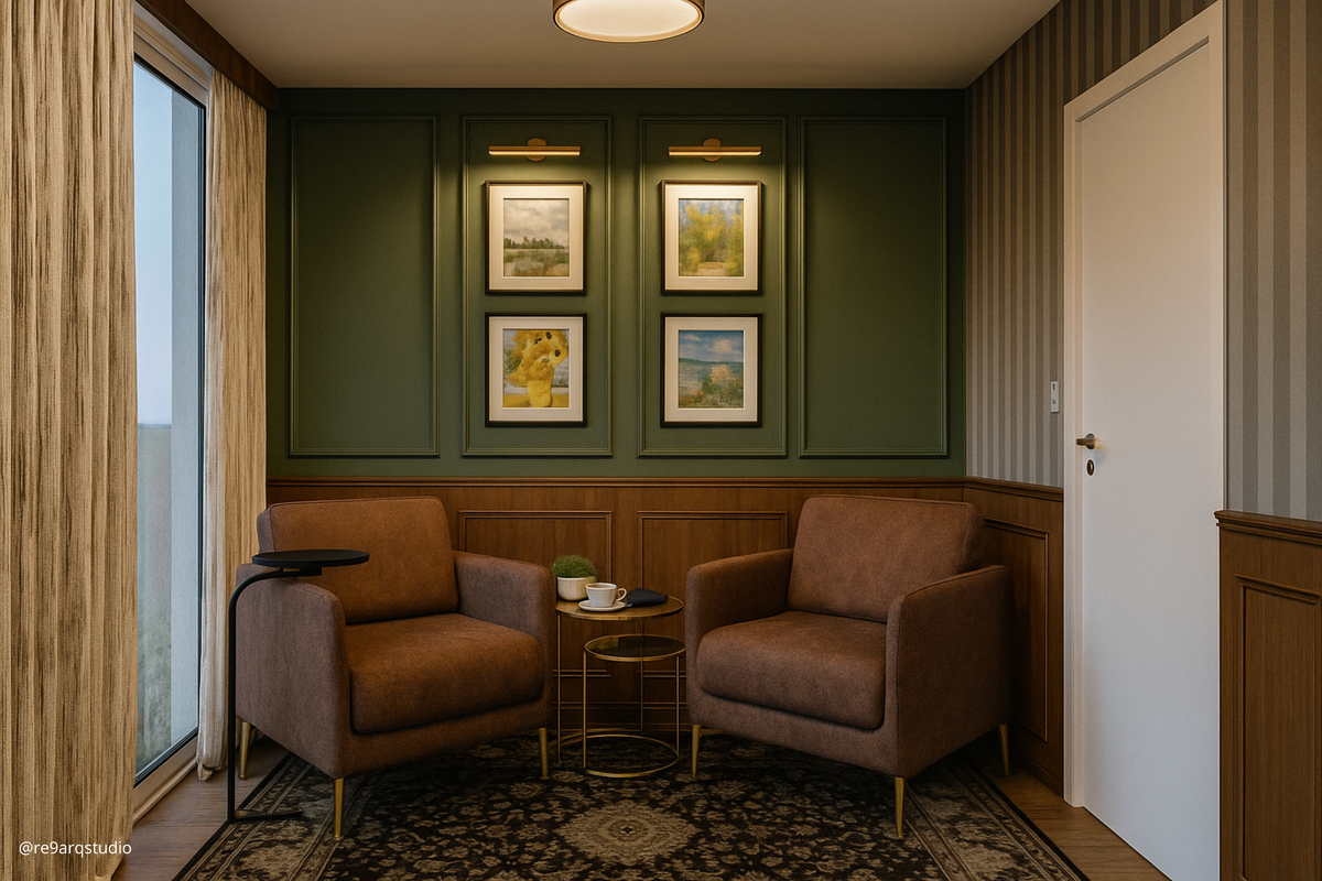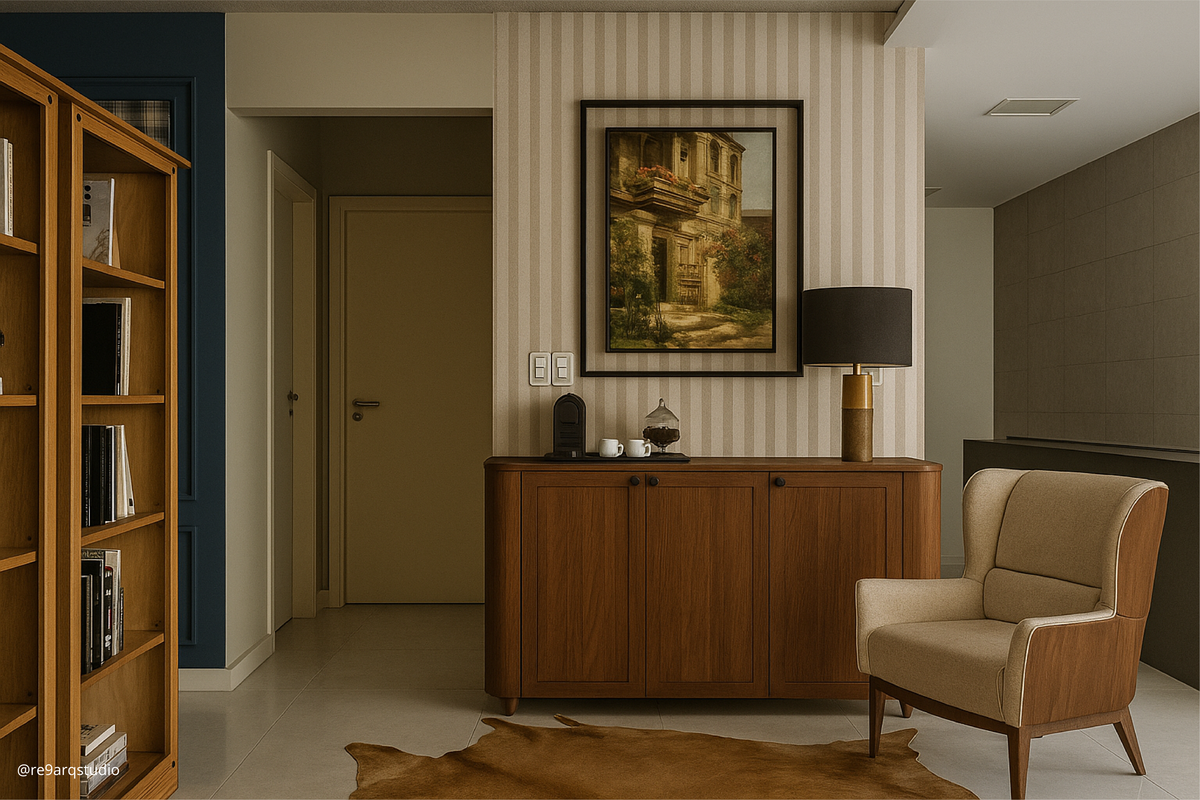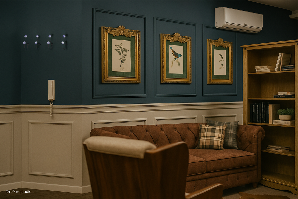 A proposta combina referências clássicas — como boiseries, painéis amadeirados, estampas, papéis de parede e iluminação pontual — com uma paleta profunda de azuis e verdes, criando uma atmosfera sóbria, acolhedora e intencionalmente marcante. Um ambiente que transmite autoridade, concentração e confiança, sem excessos.